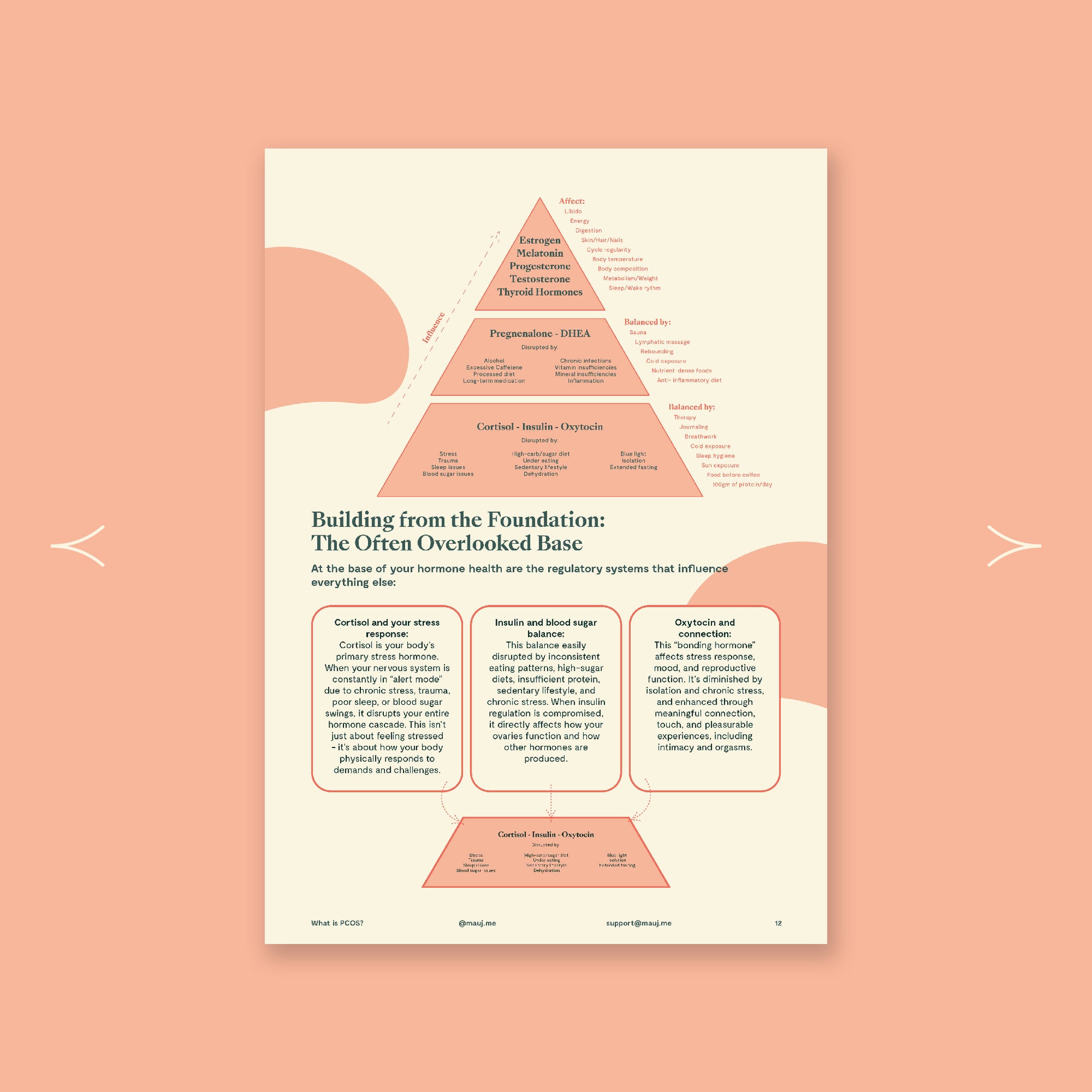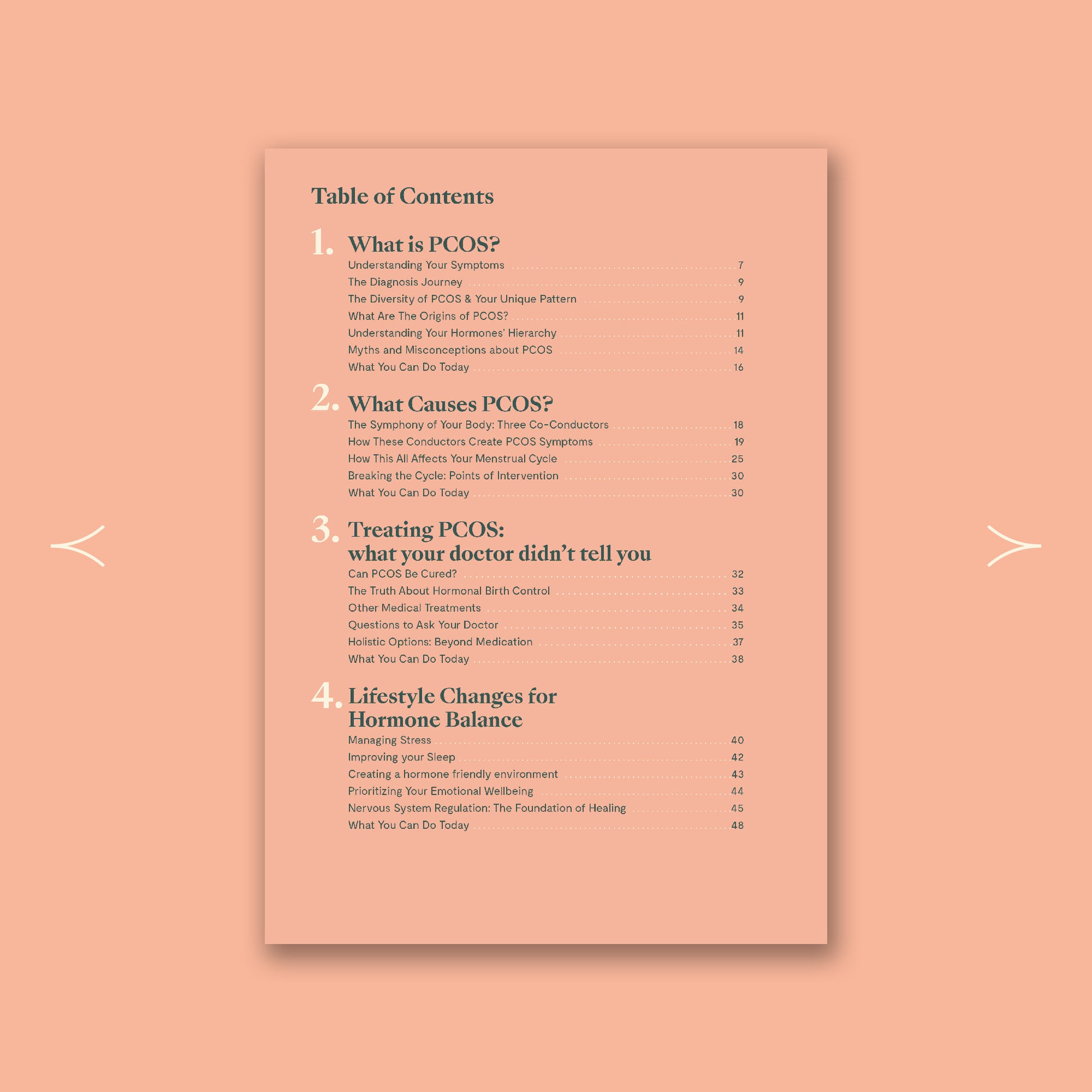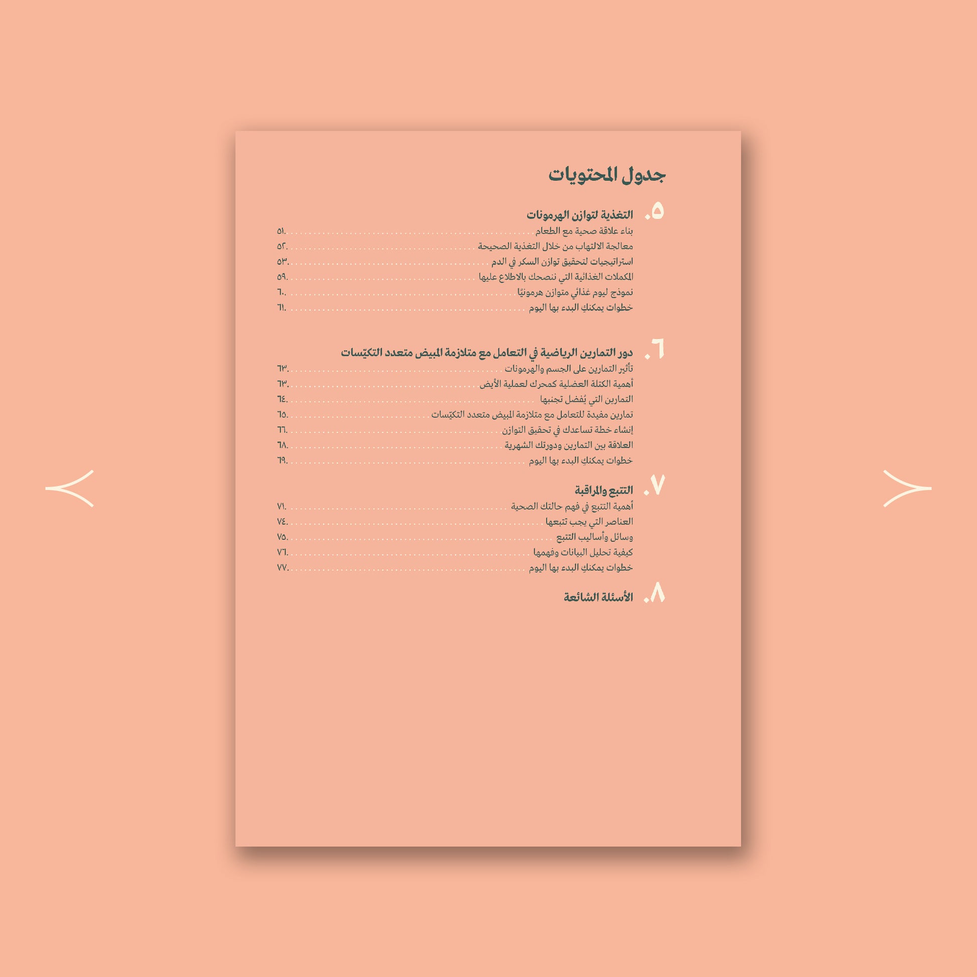 المعرفة قوة، وهذا الدليل مليء بالمعلومات السهلة الفهم حول متلازمة المبيض متعدد التكيّسات. من تحليل الهرم الهرموني إلى شرح السبب الذي يجعل بعض الأطعمة والعادات مهمة، يقدّم لك هذا الدليل شرحًا كاملًا ليساعدك على اتخاذ القرارات المناسبة لتعزيز صحتك. بفضل هذه المعلومات القيّمة، سوف تصبحين قادرة على الدفاع عن جسدك والإمساك بزمام صحتك. ستفهمين أخيرًا ما هي التغييرات التي تساعدك على الشعور بالتحسن وكيف يتم ذلك.