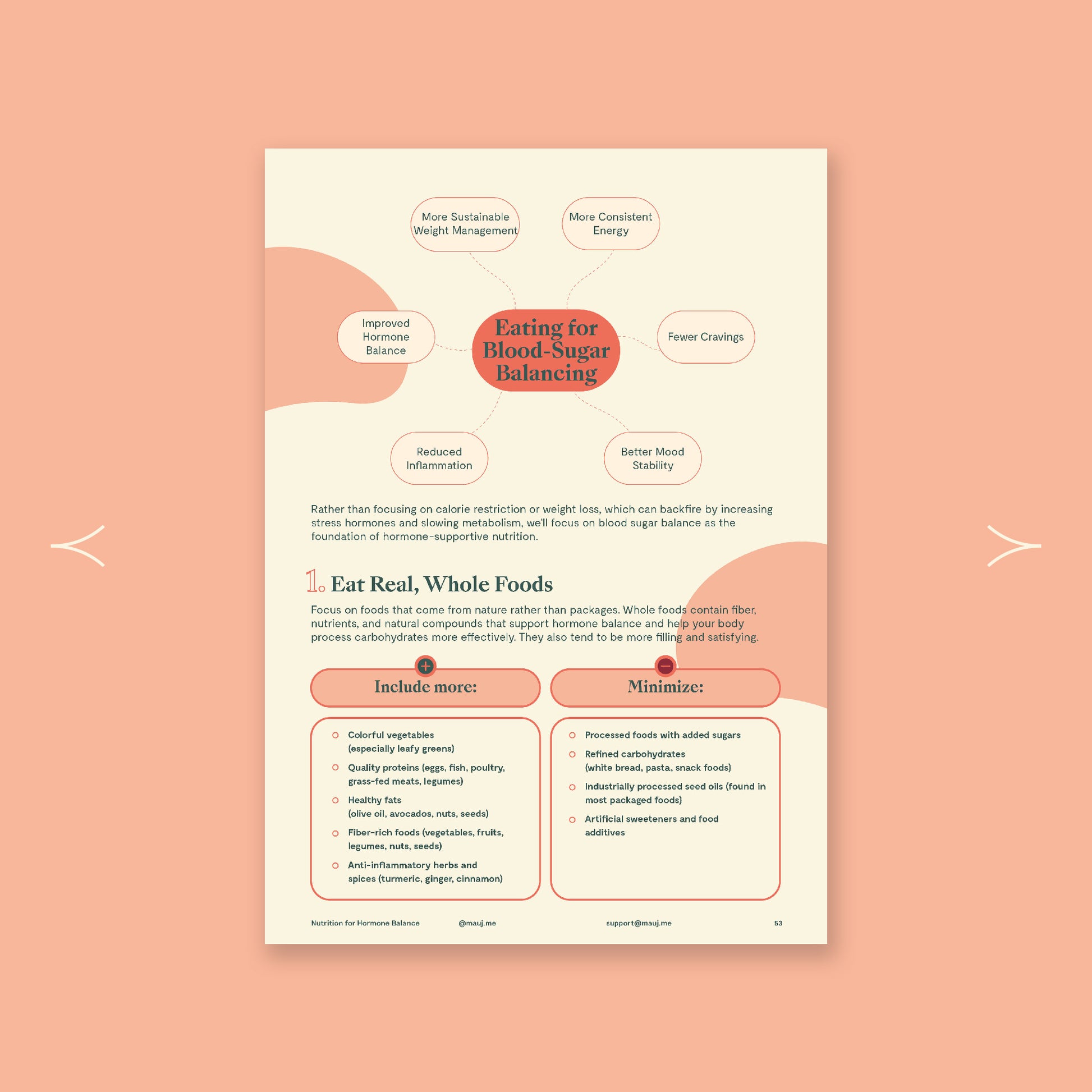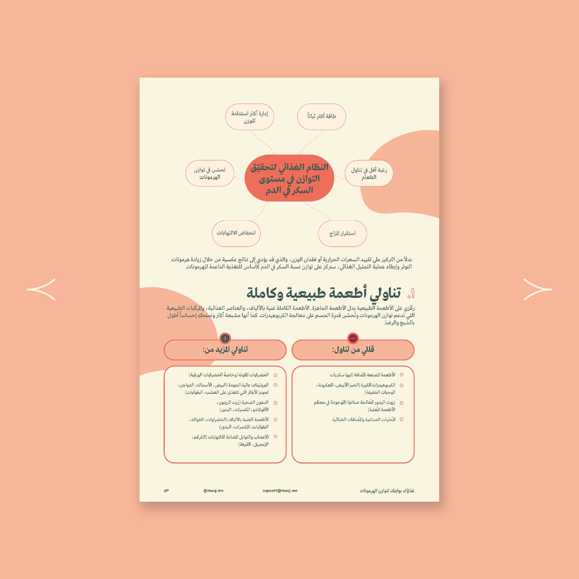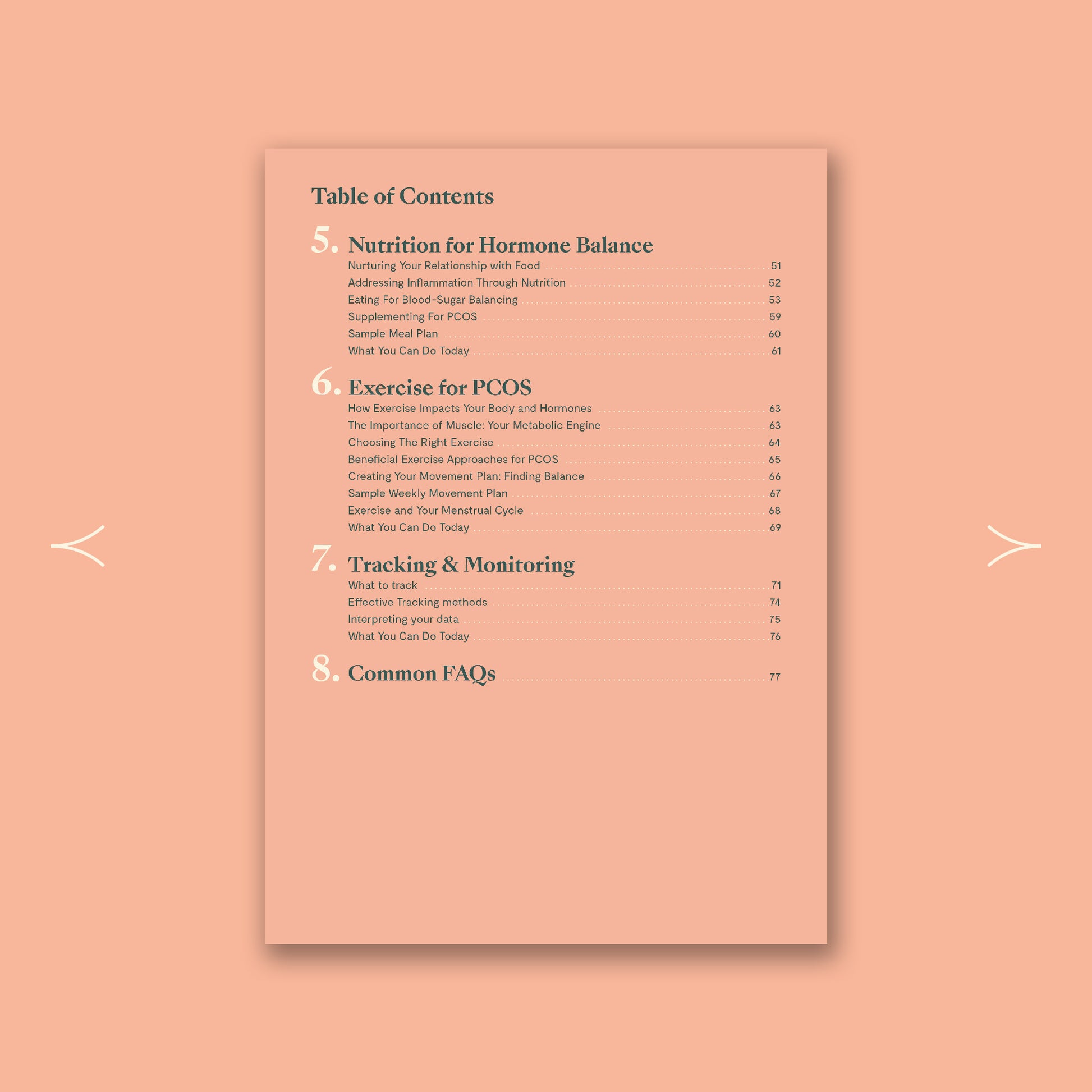 يضمّ الدليل 8 أقسام متعمقة تغطّي كل ما تحتاجينه من المعلومات حول التغذية والحركة إلى النصائح لتوازن الهرمونات، الأدوات التي من شأنها أن تساعدك في تحسين نمط الحياة، وتتبع التقدّم. يقدّم هذا الدليل خطوات عمليّة تناسبك أينما كنتِ في رحلتك نحو التعافي.
